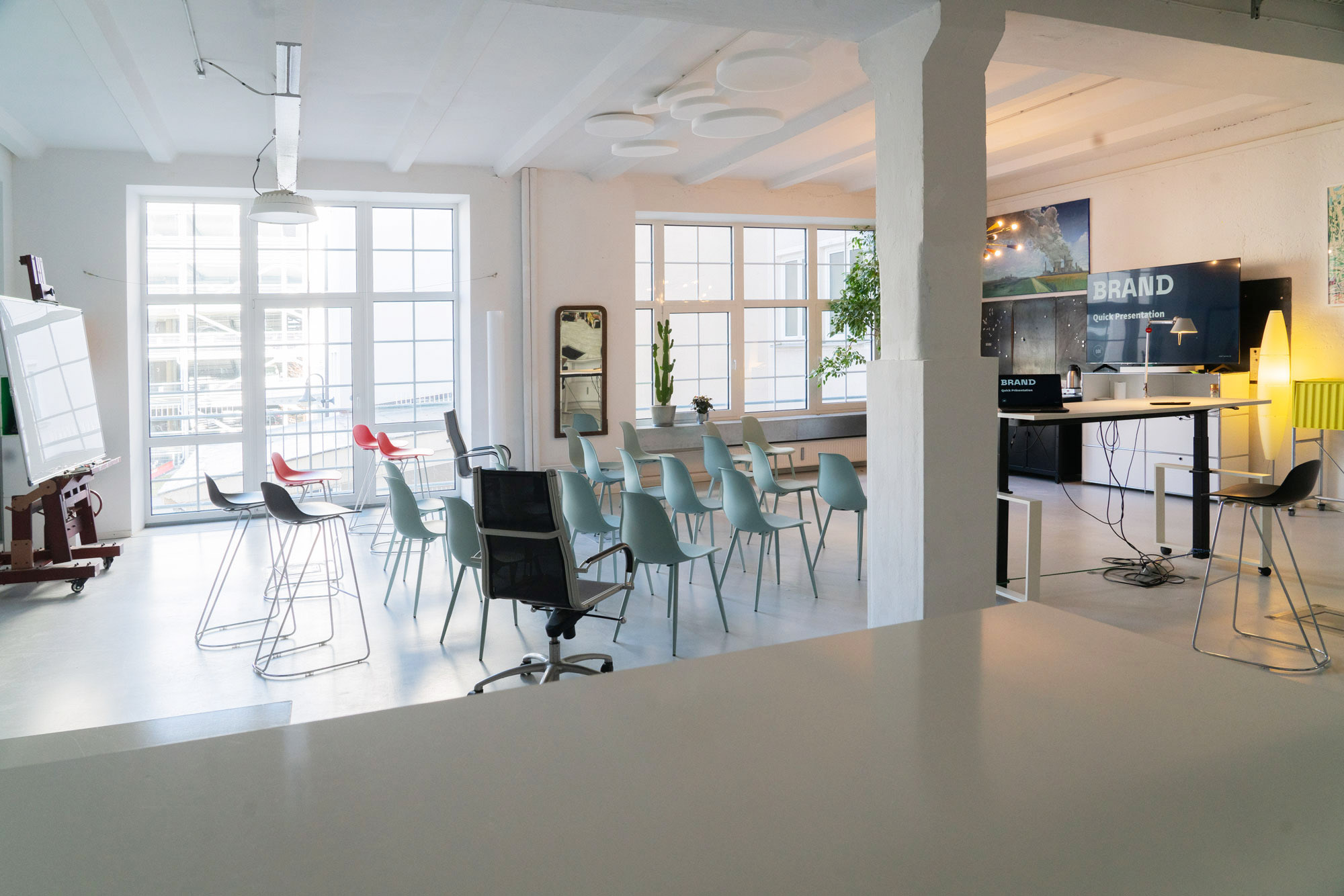 Für Präsentationen ist schon ein 75 Zoll Monitor und ein großes, bewegliches Flipchart Teil der Ausstattung. Für ein Shooting kann der Raum auch entleert oder umgestellt werden. WLAN ist selbstverständlich.